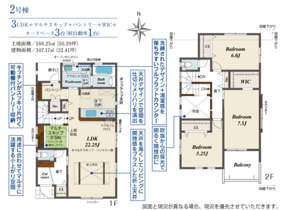 間取内容 | LDK22.25帖 1階 洋室7.5帖 2階 洋室6帖 2階 洋室5.25帖 2階 LDKにマルチスキップ2.5帖含む |