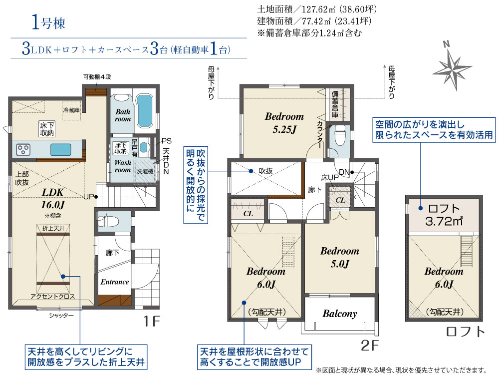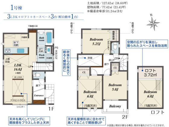 | 敷地全体面積 | 127.62m²(38.6坪) | 延べ床面積 | |