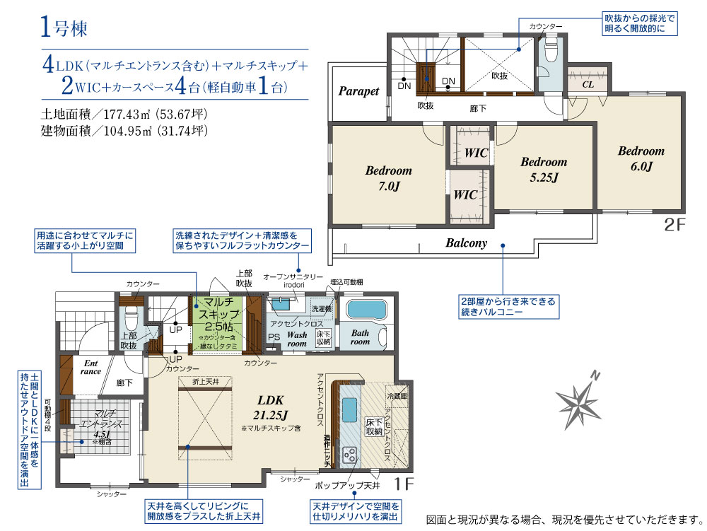 | 間取内容 | LDK21.25帖 1階 洋室7帖 2階 洋室6帖 2階 洋室5.25帖 2階 その他4.5帖 1階 LDKにマルチスキップ2.5帖含む |