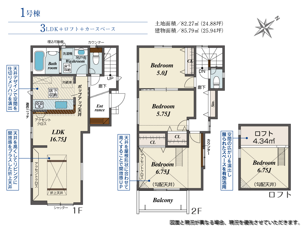 | 間取内容 | LDK16.75帖 1階 洋室6.75帖 2階 洋室5.75帖 2階 洋室5帖 2階 ロフトあり |