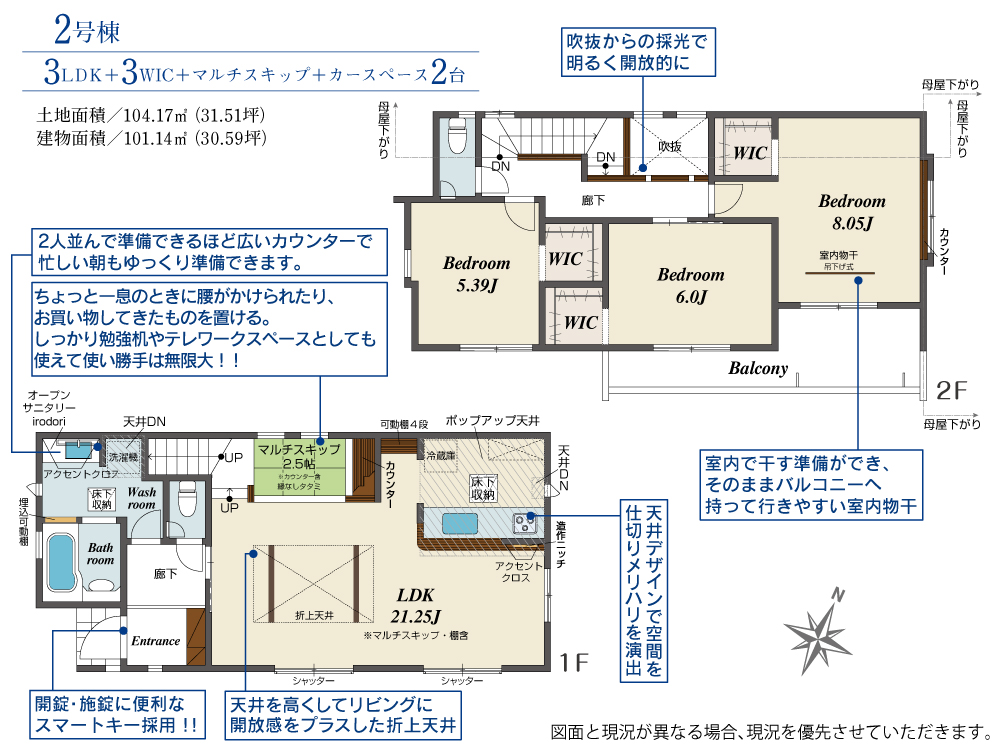 | 間取内容 | LDK21.25帖 1階 洋室8.05帖 2階 洋室6帖 2階 洋室5.39帖 2階 LDKにマルチスキップ2.5帖含む |