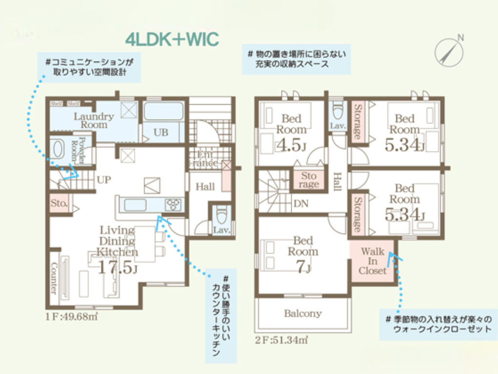 | 間取内容 | LDK17.5帖 1階 洋室7帖 2階 洋室5.34帖 2階 洋室5.34帖 2階 洋室4.5帖 2階 | ||