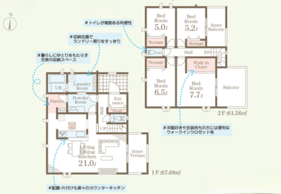 間取内容 LDK21帖 1階 洋室7.7帖 2階 洋室6.5帖 2階 洋室5.2帖 2階 洋室5帖 2階