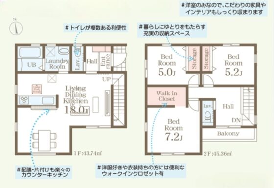| 間取内容 | LDK18帖 1階 洋室7.2帖 2階 洋室5.2帖 2階 洋室5帖 2階 | ||