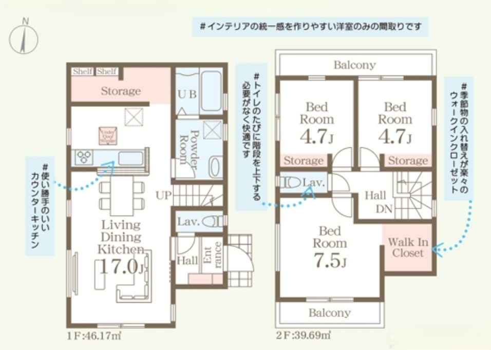 | 間取内容 | LDK17帖 1階 洋室7.5帖 2階 洋室4.7帖 2階 洋室4.7帖 2階 | ||