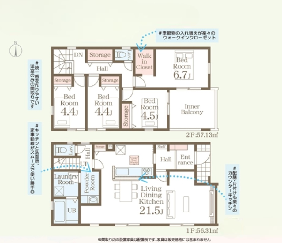 | 間取内容 | LDK21.5帖 1階 洋室6.7帖 2階 洋室4.5帖 2階 洋室4.4帖 2階 洋室4.4帖 2階 | ||