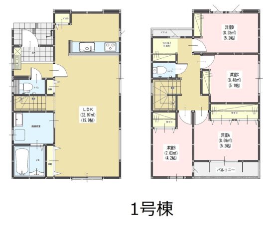 | 間取内容 | LDK19.9帖 1階 洋室5.2帖 2階 洋室5.2帖 2階 洋室5.1帖 2階 洋室4.2帖 2階 | ||