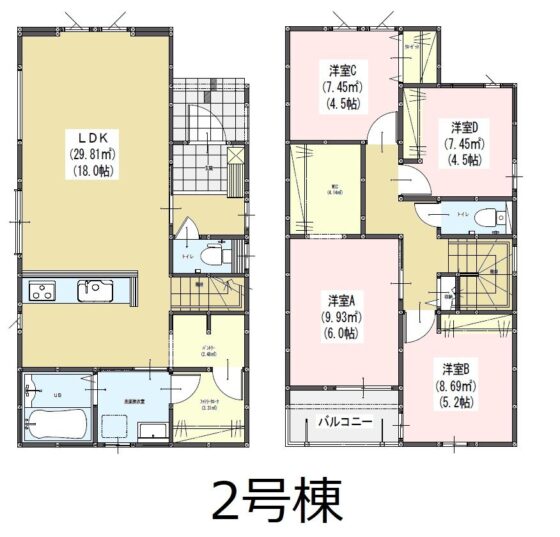 | 間取内容 | LDK18帖 1階 洋室6帖 2階 洋室5.2帖 2階 洋室4.5帖 2階 洋室4.5帖 2階 | ||