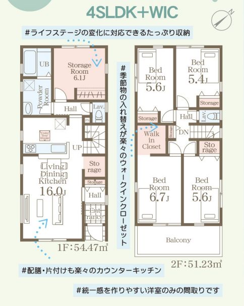 | 間取内容 | LDK16帖 1階 洋室6.7帖 2階 洋室5.6帖 2階 洋室5.6帖 2階 洋室5.4帖 2階 | ||