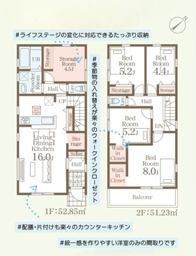 | 間取内容 | LDK16帖 1階 S4.5帖 1階 洋室8帖 2階 洋室5.2帖 2階 洋室5.2帖 2階 洋室4.4帖 2階 | ||