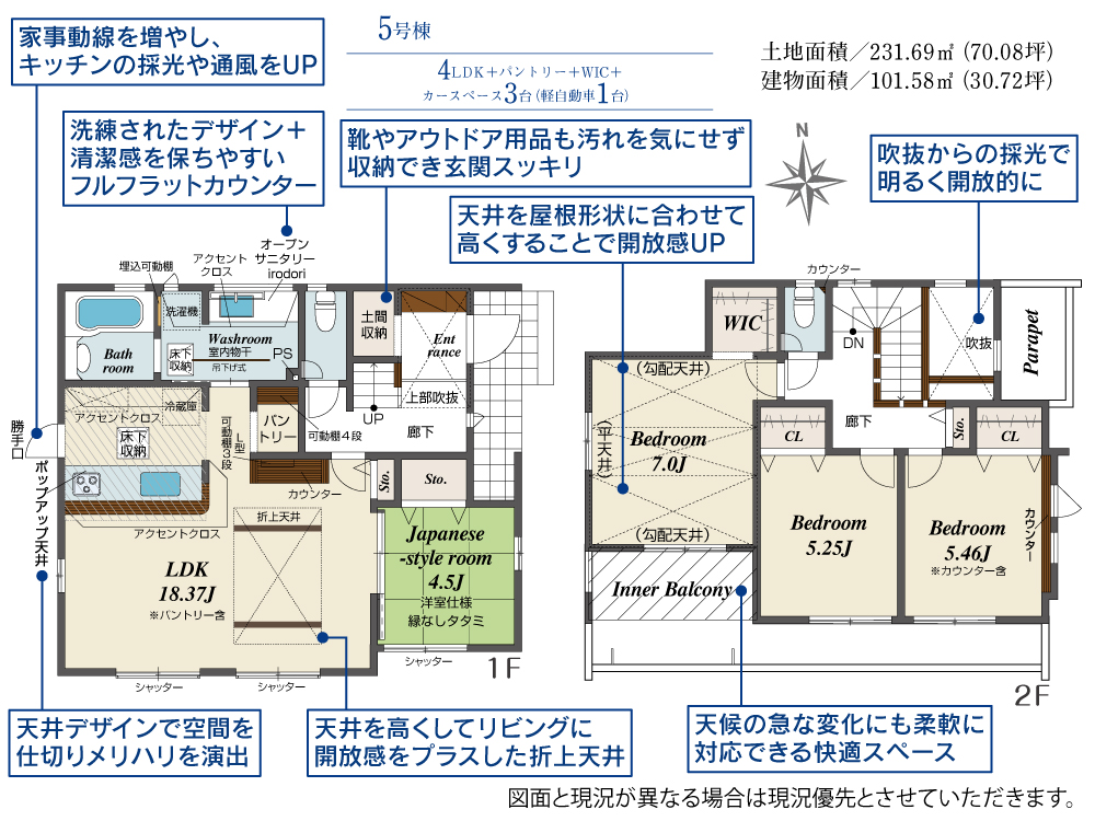 | 間取内容 | LDK18.37帖 1階 和室4.5帖 1階 洋室7帖 2階 洋室5.46帖 2階 洋室5.25帖 2階 | ||
