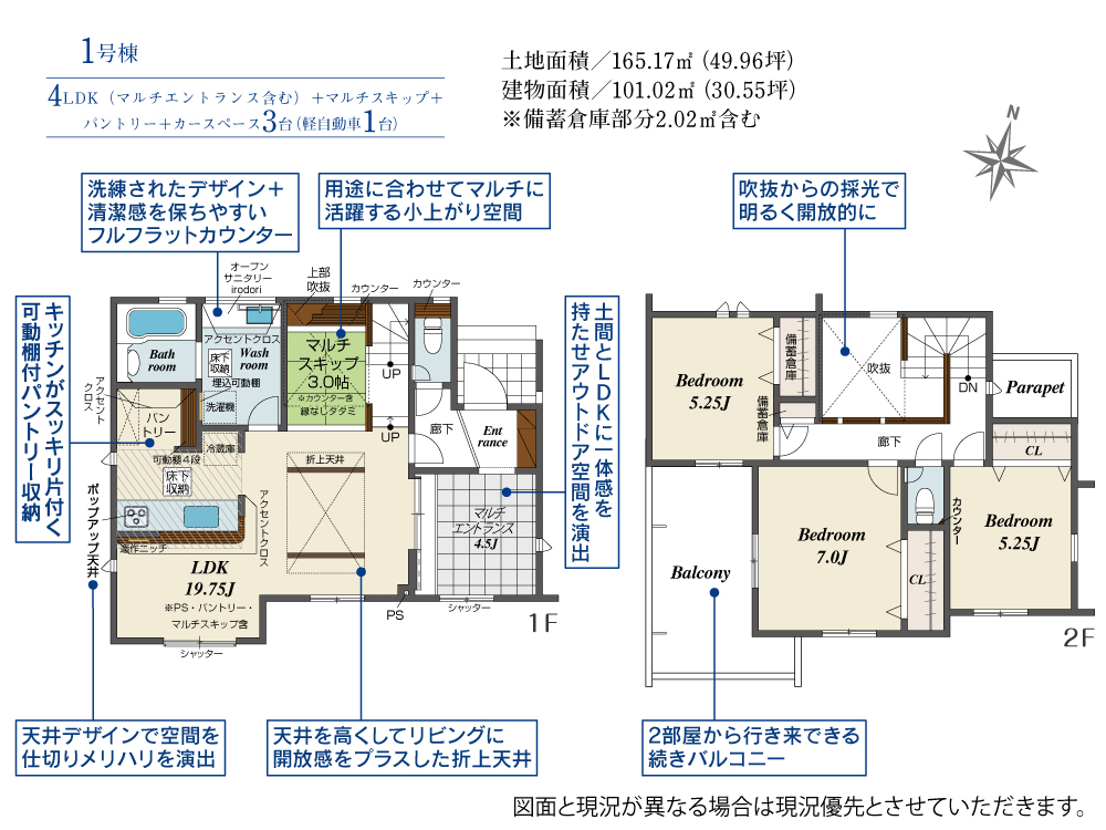 | 間取内容 | LDK19.75帖 1階 洋室7帖 2階 洋室5.25帖 2階 洋室5.25帖 2階 その他4.5帖 1階 LDKにマルチスキップ3帖含む |