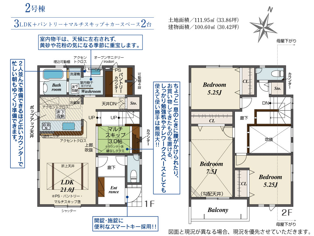 | 間取内容 | LDK21帖 1階 洋室7.5帖 2階 洋室5.25帖 2階 洋室5.25帖 2階 LDKにマルチスキップ3帖含む |