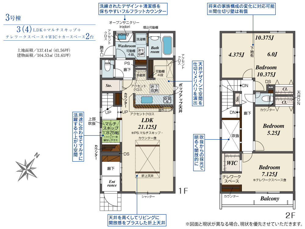 | 間取内容 | LDK21.12帖 1階 洋室10.37帖 2階 洋室7.12帖 2階 洋室5.25帖 2階 LDKにマルチスキップ1.875帖含む |
