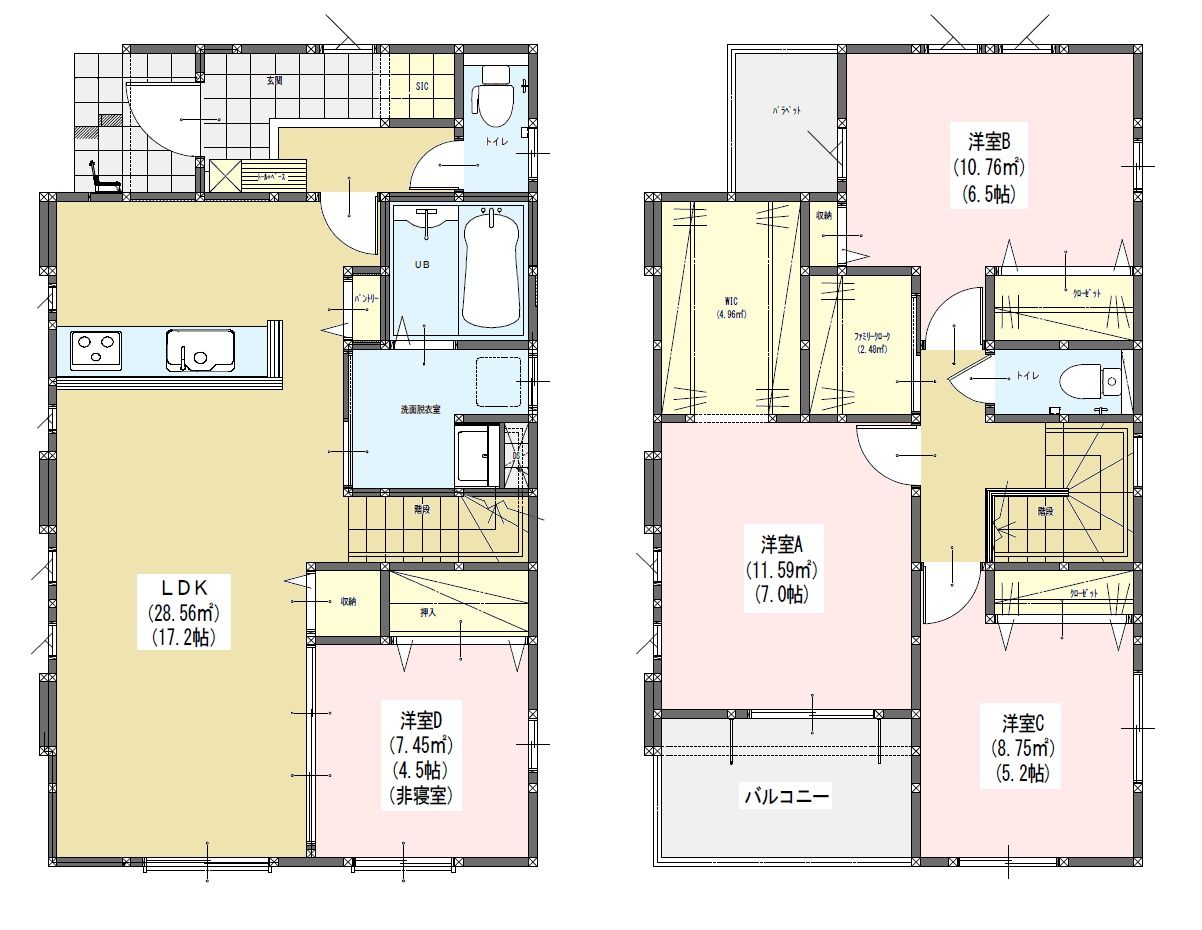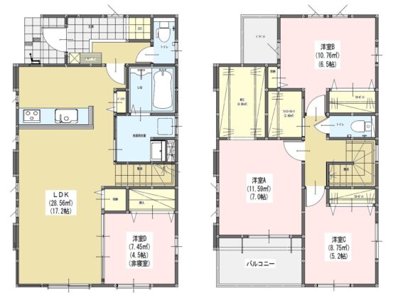 | 間取内容 | LDK17.2帖 1階 洋室4.5帖 1階 洋室7帖 2階 洋室6.5帖 2階 洋室5.2帖 2階 | ||